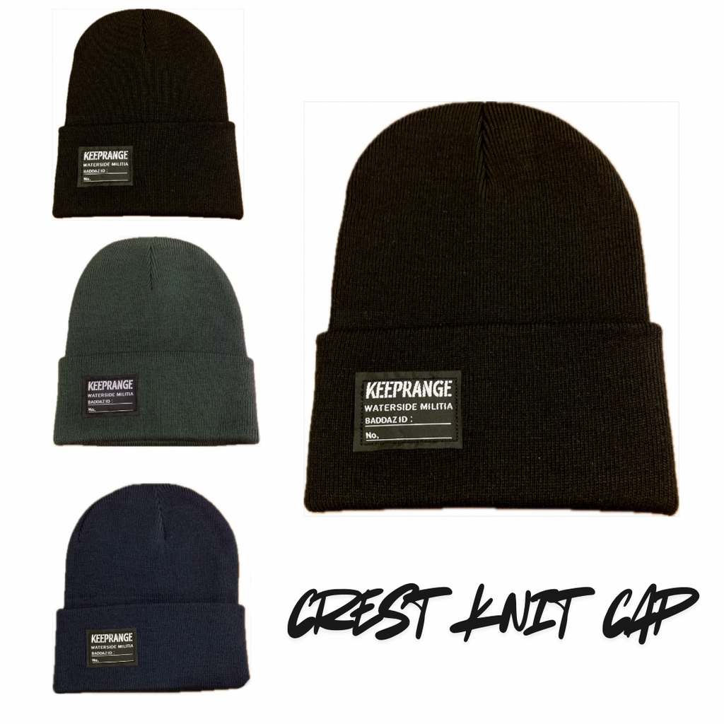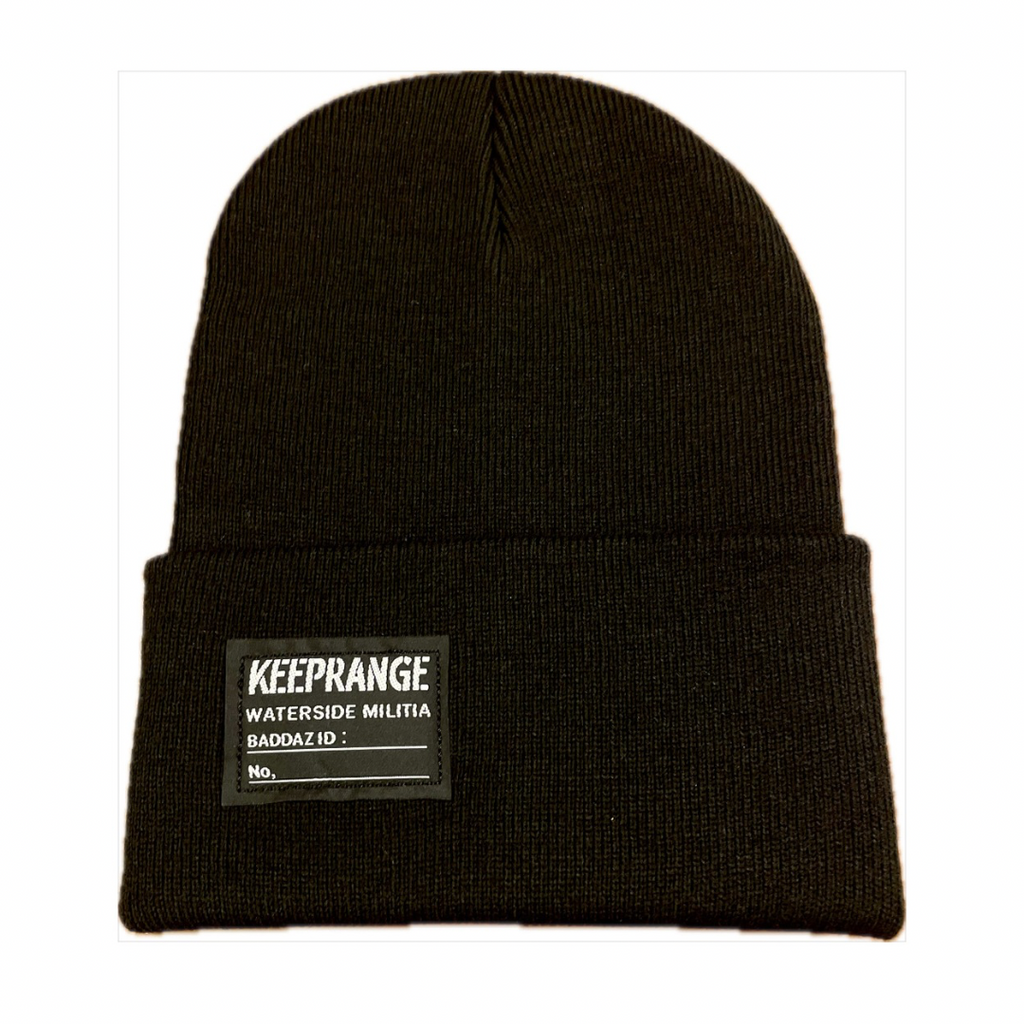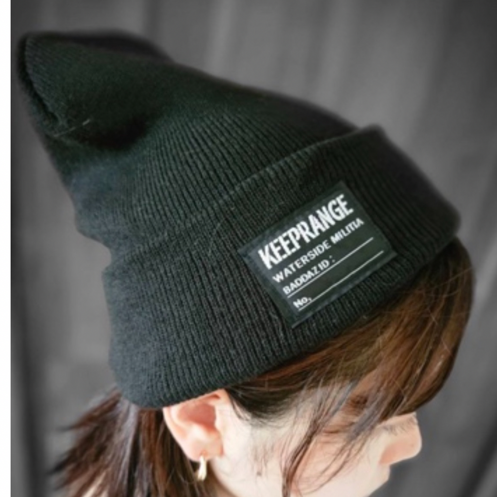 やや正面を外したサイドの位置にKEEPRANGEのニューパッチを付けた秋冬から春までシンプルナイスにコーディネートをビシっと決めてくれるニットキャップ です。